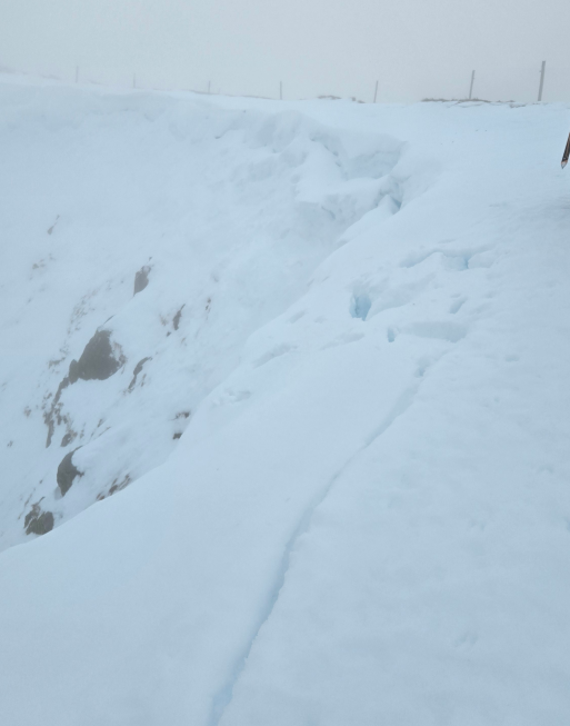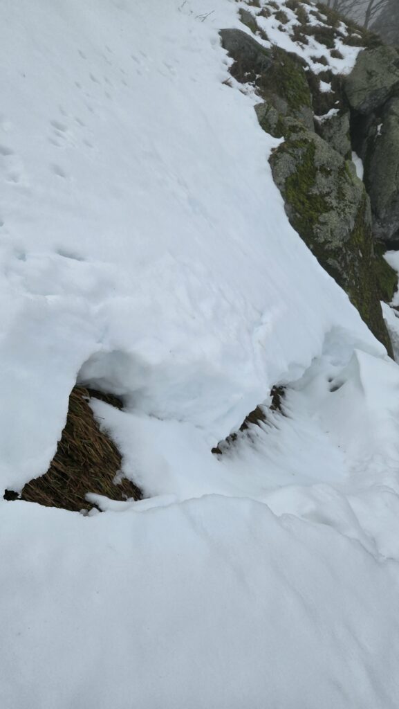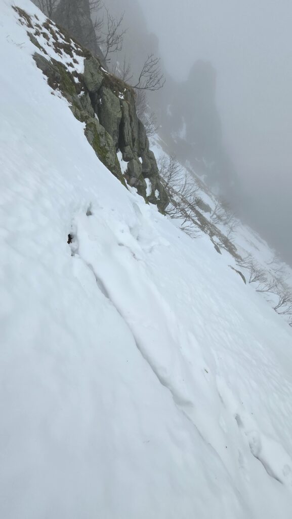 Une fois 10h du matin la neige ne portait presque plus et on s’enfonçait bien. Les corniches cèdent un peu et belle fissure au dessus, il ne serait pas prudent de passer par là.