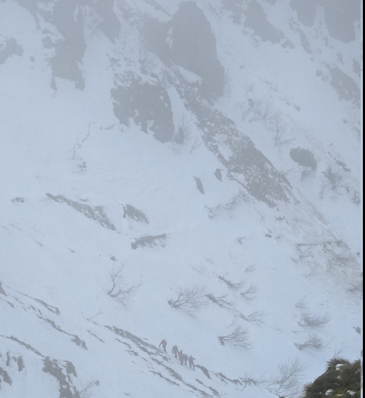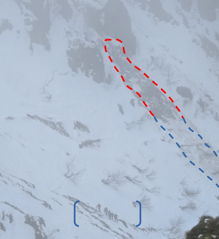 A mi pente du premier couloir à gauche, une coulée s’est déclenchée suite au redoux sur une pente herbeuse (en rouge), sans ancrage au sol. Le dépôt s’est arrêté sur l’itinéraire classique du col du Falimont (en bleu). Voir les alpinistes dans l’encadré.