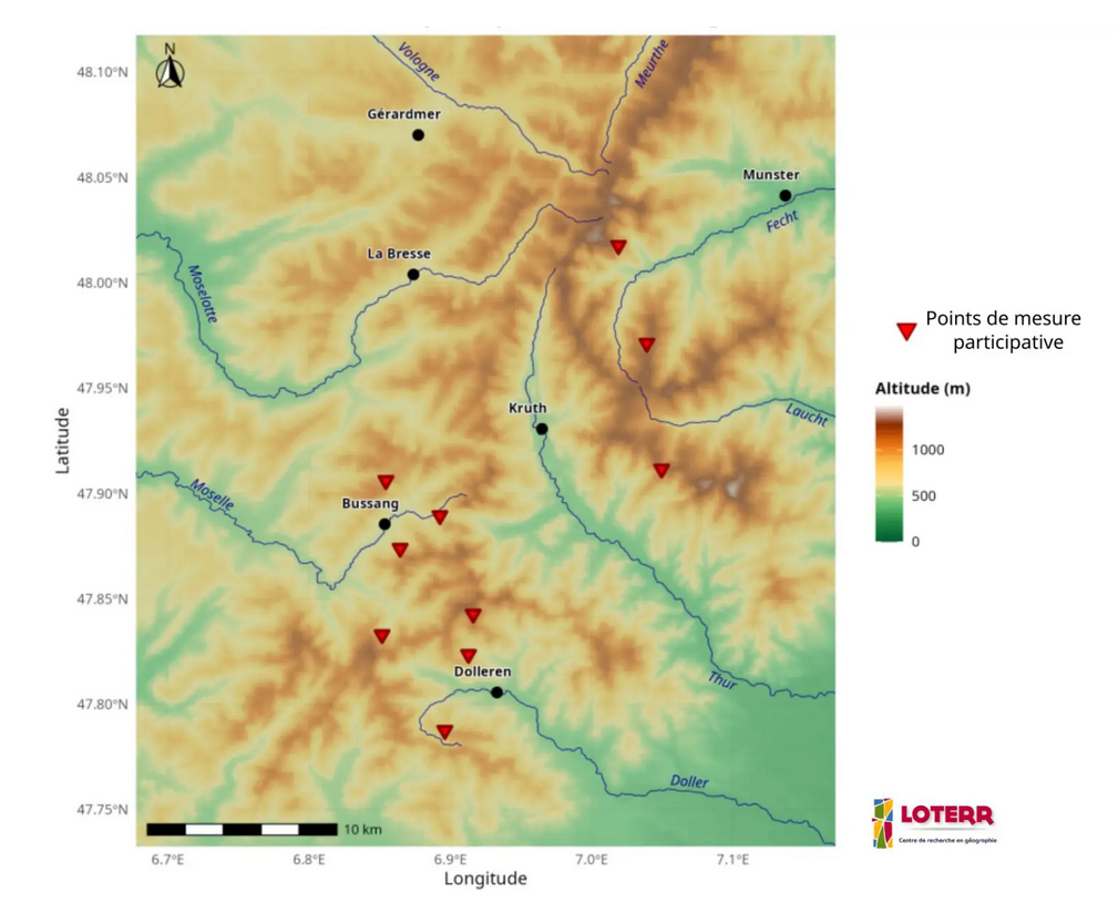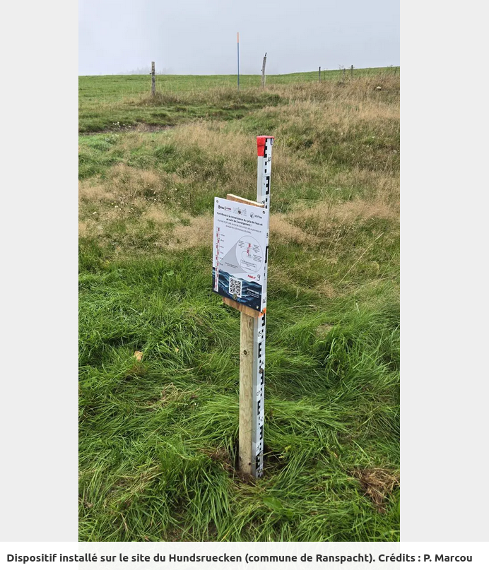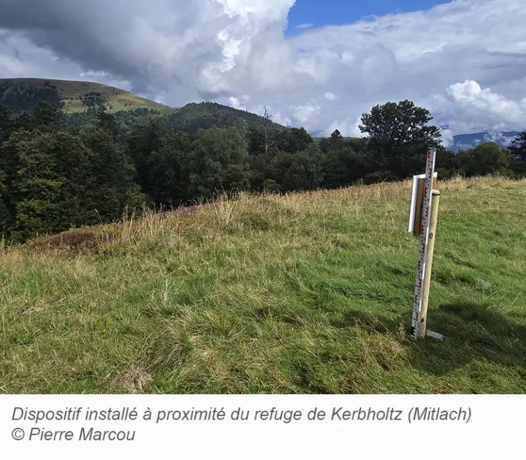 Un réseau d’une dizaine de points de mesure (voir la carte en galerie) équipés d’échelles graduées et de panneaux explicatifs, a été déployés pour documenter l’enneigement pendant les hivers 2025-2026 et 2026-2027. Une dizaine de stations ont été installées avec l’expertise de Luc Manceau, ingénieur d’étude au LOTERR, dans les vallées de la Doller, de la Fecht, de la Moselle et de la Thur, couvrant des communes comme Bussang, Dolleren ou encore Sewen. Chaque dispositif est associé à un questionnaire en ligne (accès par QR code), qui permet aux citoyens (randonneurs, forestiers, etc.) de transmettre en ligne leurs observations.